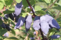 Жимолость съедобная. Крупноплодные сорта. Вкусные синие ягоды созревают уже во конце мая. "Голубое веретено", "Виола" - ранняя; "Синяя птица", "Нимфа" - средняя; "Фиалка" - среднепоздняя.